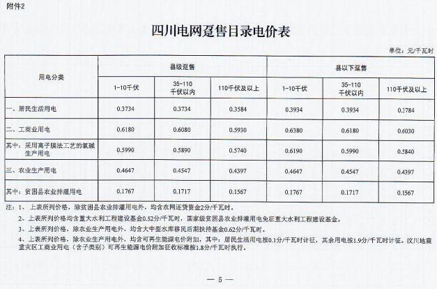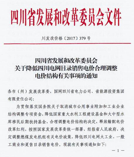 近日,四川省發(fā) 改 委發(fā)布了《四川省發(fā)展和改革委員會關于降低四川電網目錄銷售電價合理調整電價結構有關事項的通知》(以下簡稱“通知”)。通知指出,自2017年7月1日起,取消向燃煤發(fā)電企業(yè)征收工業(yè)企業(yè)結構調整專項資金,降低重大水利工程建設基金和中大型水庫移民后期扶持基金征收標準,降低后的征收標準分別為0.52分/千瓦時、0.62分/千瓦時。燃煤發(fā)電機組有關電價政策另行明確。具體情況如下: