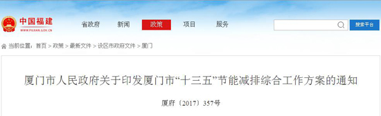 廈門市印發:《廈門市“十三五”節能減排綜合工作方案》