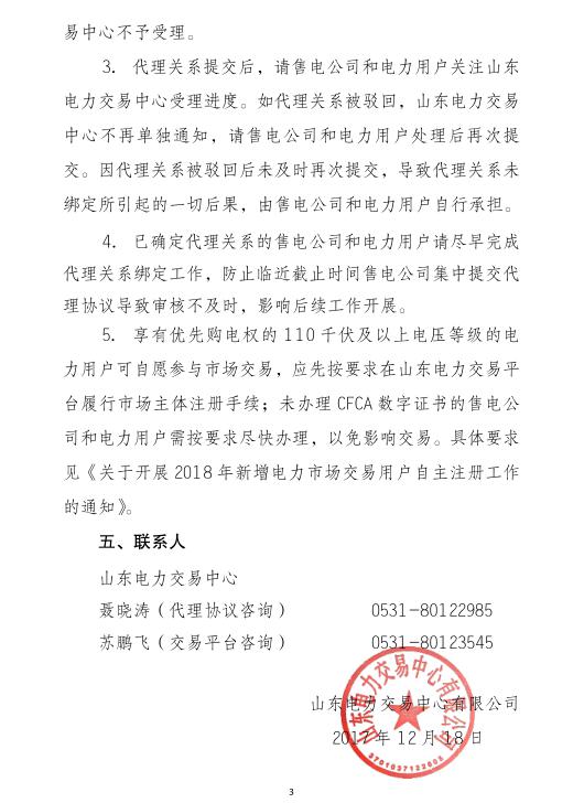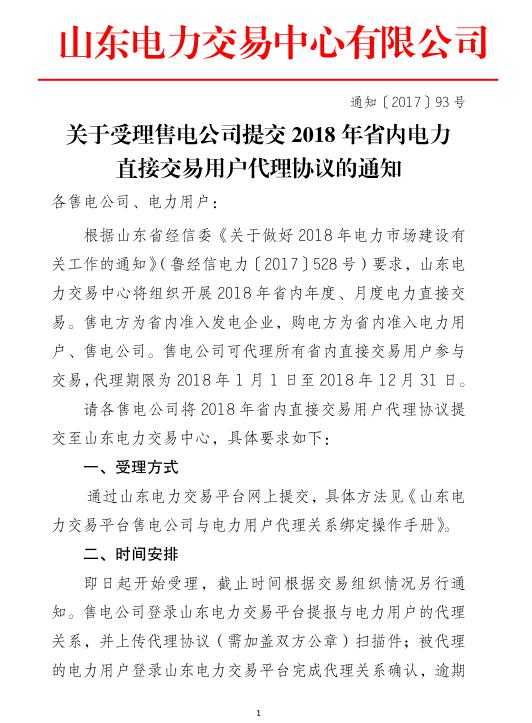 山東電力交易中心發布:關于受理售電公司提交2018年省內電力直接交易用戶代理協議的通知
