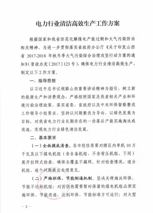 ??為進一步落實省政府辦公廳《關于印發山西省2017-2018年秋冬季大氣污染綜合治理攻堅行動方案的通知》(晉政辦發〔2017〕123號)精神,推進電力行業清潔高效生產,解決我省電力行業一些落后產能長期存在的問題,特制定《電力行業清潔高效生產工作方案》,現印發你們,請認真組織落實,抓好整改實施。